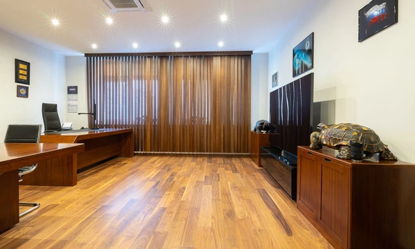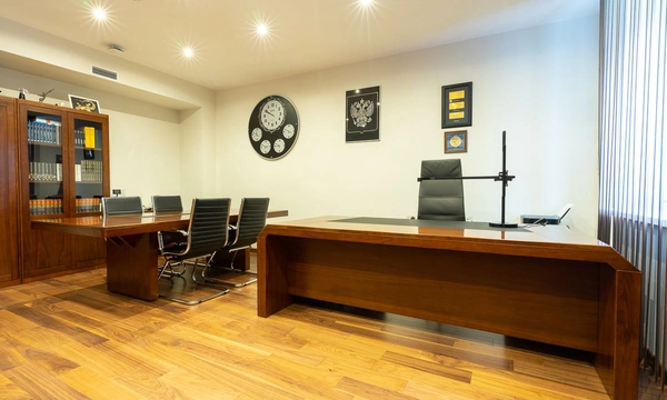Недавно мы закончили проект по обустройству кабинета одного из руководителей компании. Работа началась с дизайн-проекта и плана расстановки мебели. В просторном помещении предстояло разместить большой рабочий стол, стол для переговоров на 4ых, зону хранения с гардеробом и найти место для кофемашины и холодильника.