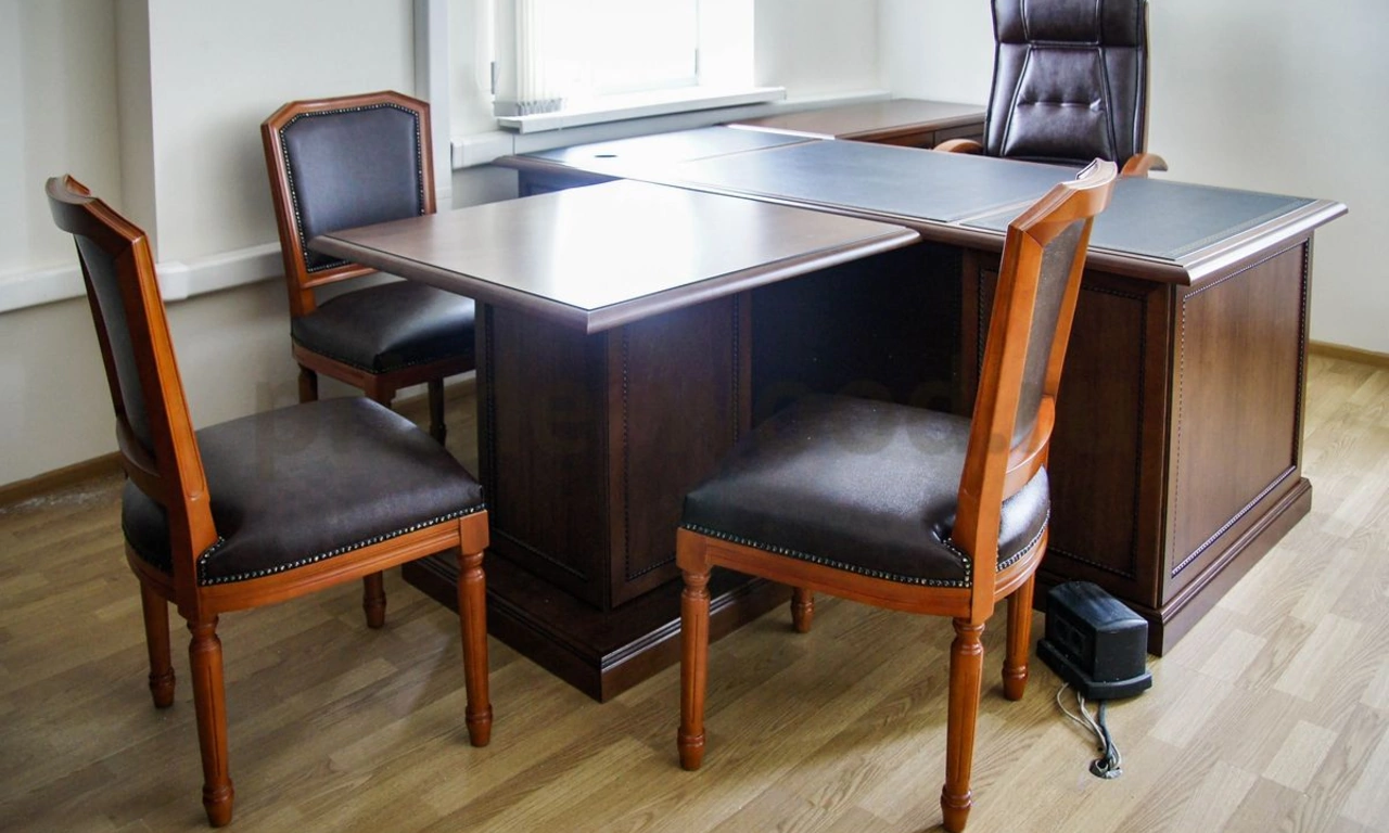 После обсуждения нюансов заказа с менеджером Prime Wood выбор остановили на мебели итальянского производства из коллекции "Conte". Массивный письменный стол со вставкой из натуральной кожи на столешнице выполнен из шпонированной МДФ и массива дерева. Брифинг-приставка, креденция и вместительный шкаф из двух секций - со стеклом и с глухими дверьми - дополняют композицию. Шесть деревянных стульев "Версаль" в классическом стиле в натуральной коже с использованием эффектных декоративных обивочных гвоздей придают интерьеру завершённый вид. Кабинет выглядит респектабельно, роскошь натуральной древесины подчёркивают его значительность.