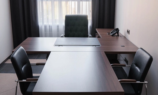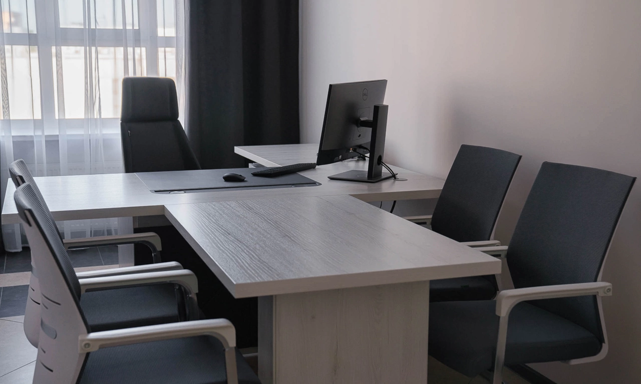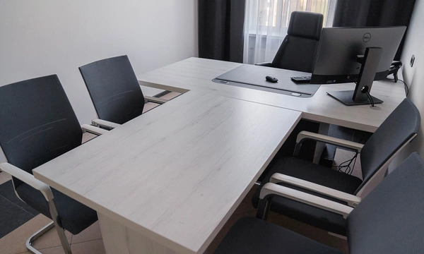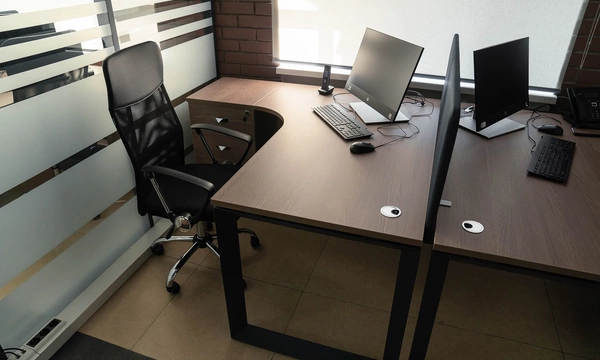 Сроки на подготовку нового офиса были сжатые, поэтому выбор заказчика сужался только теми коллекциями, которые было возможно поставить максимально оперативно. Для персонала была выбран наш хит продаж - Onix на металлических опорах в цвете антрацит, а под цвет опор подобраны классные чёрные текстильные перегородки. На креслах для сотрудников решили не экономить, каждый сотрудник получил кресло руководителя 8074 с дышащей сетчатой спинкой и подголовником из кожи или полностью кожаное кресло 6003-1s на выбор.